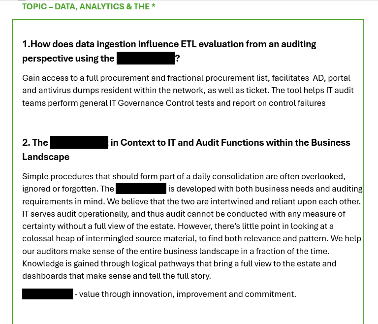A B2B professional services needed help communicating their new GRC division capabilities. The challenge remained establishing credibility in an emerging market while maintaining an established IT services reputation. The brief would extend to incorporate enhanced AI capability. I positioned the offering within a broad enterprise context to gain momentum with existing services, as well as niching within the audit space which fits in perfectly with existing stakeholder expertise and experience.