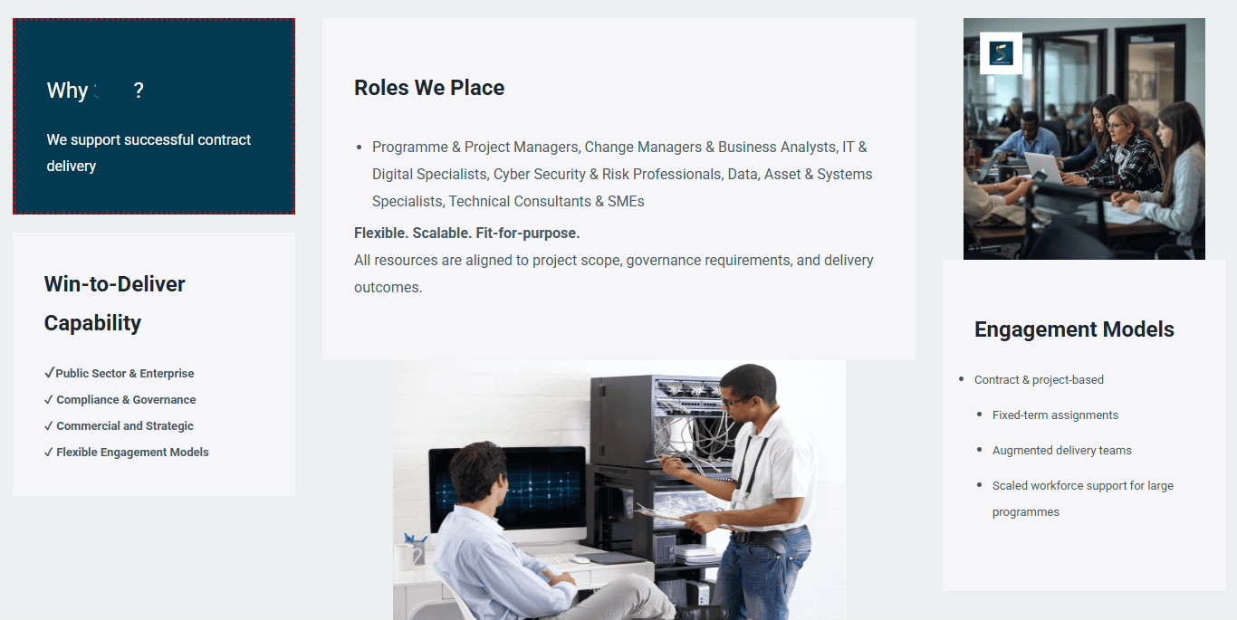 I designed, wrote and launched the entire site independently. The design needed to project ambition and credibility. Copy was built around the firm's three core service lines: workforce management, technology reselling, and bid management, with messaging structured to speak to both procurement-led buyers in the public sector and commercially-driven decision-makers in enterprise.